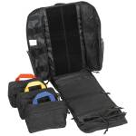 Zadnja stran: Velika površina z “loop” flisom, vključno s 3 snemljivimi torbicami (ročaji različnih barv); ob straneh elastične zanke in 2 mrežasta žepa z zadrgo.