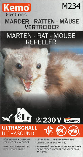 Kemo M234 je visoko zmogljiv ultrazvočni odganjalec, zasnovan za učinkovito odganjanje kun, podgan, miši in drugih glodalcev iz garaž, podstrešij, hlevov, motornih prostorov in drugih objektov. Naprava oddaja močan, živali izjemno moteč spremenljiv ultrazvok (okoli 22,5–28 kHz) z zvočnim tlakom do 120 dB, ki ga ljudje ne slišimo.